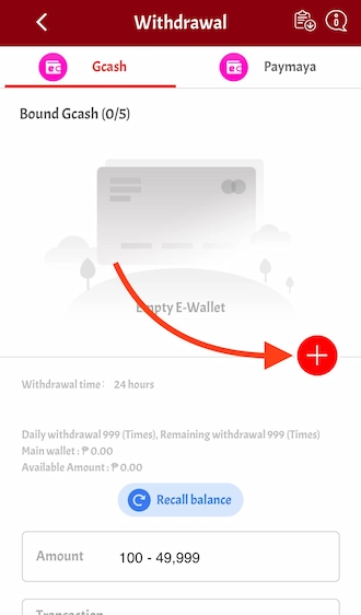 Step 1: Go to Withdrawal and select PayMaya. Then click on the red plus icon to add a PayMaya account.